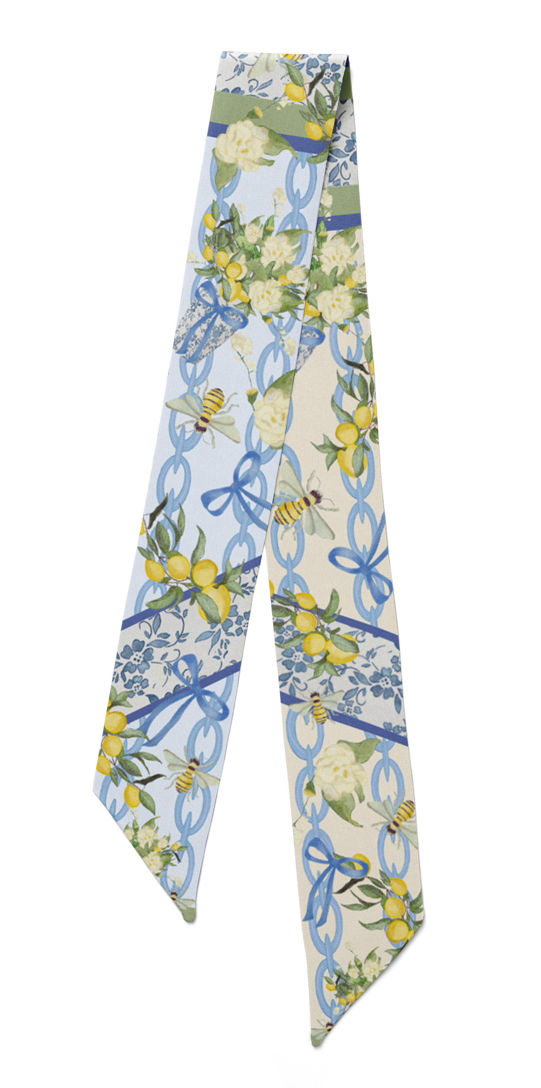 Embrace the refreshing charm of spring with this elegant scarflette scarf. Adorned with a delicate pattern of yellow lemons, white roses, and playful honey bees against a soft blue and cream background, this versatile accessory brings a touch of garden-inspired sophistication to any outfit.
