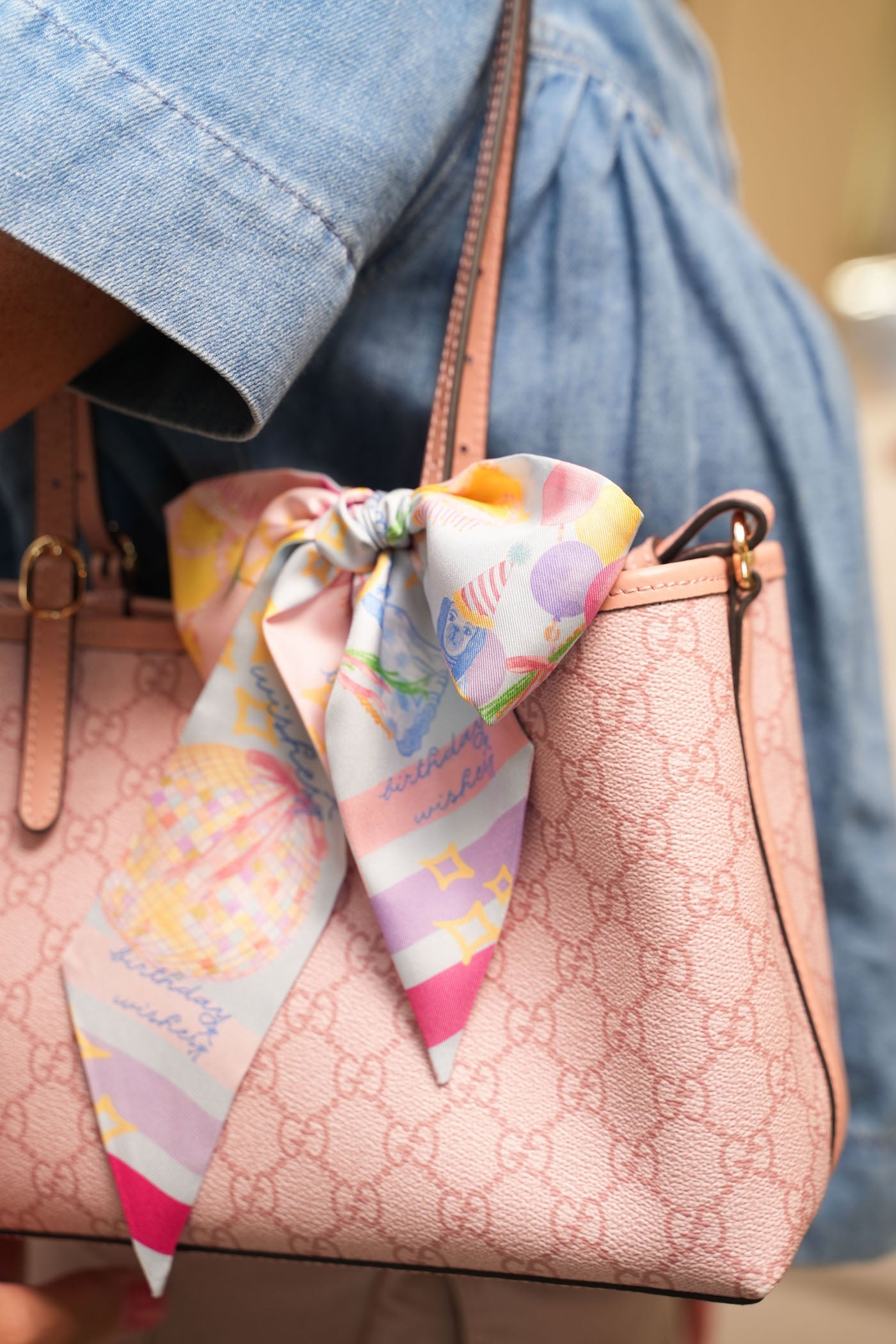 Celebrate every birthday wish with our playful Celebration scarflette! This whimsical silk accessory features a cheerful pastel palette of pink and blue sections adorned with festive party motifs including colorful balloons, disco balls, party hats, and cute teddy bears, all sprinkled with birthday wishes and sparkling star accents.