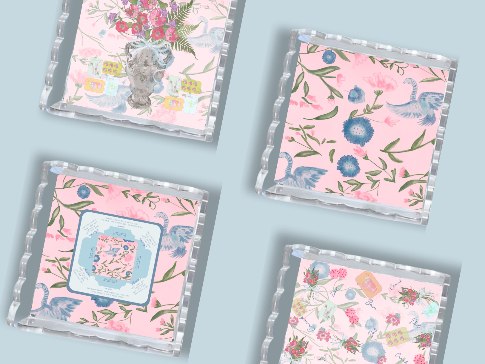 Elevate your game night with our Custom Mahjong Acrylic Tray Collection, thoughtfully designed to bring both style and versatility to your table. Each luxurious tray features our signature clear acrylic construction with four interchangeable inserts, allowing you to refresh your look as easily as you shuffle your tiles.