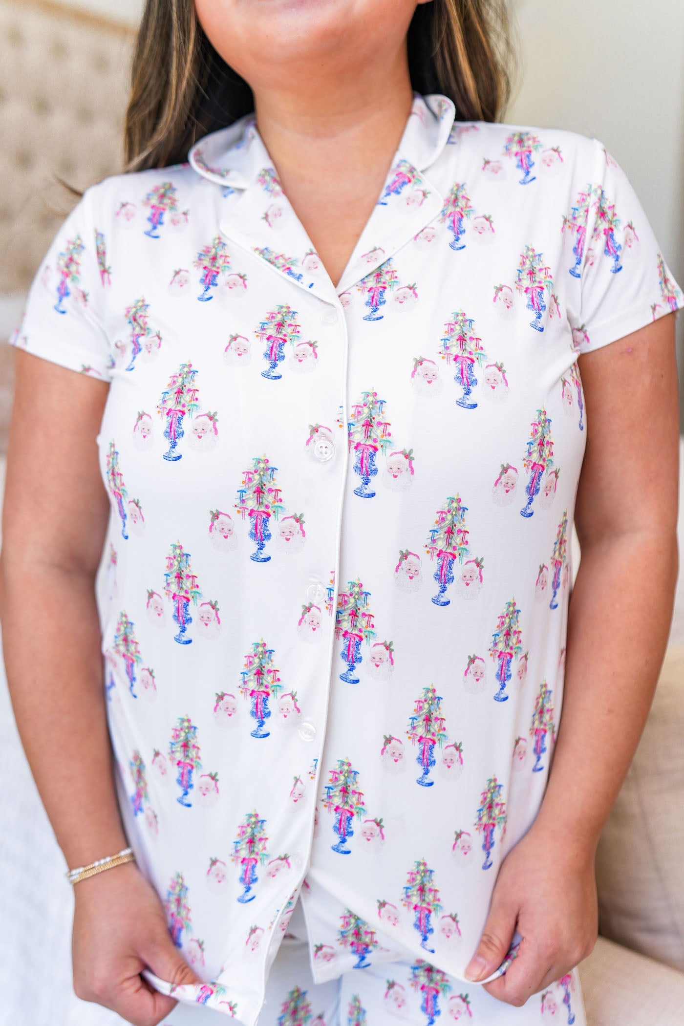Introducing our festive Sassy Santa Heirloom Pajama Pants Set, featuring a playful and spirited print that brings holiday cheer with a touch of feminine flair. Designed in-house by our co-founder Elise, this delightful pattern showcases chic Santa figures adorned in vibrant pink and blue accents against a crisp white background, creating the perfect blend of Christmas magic and modern sophistication.